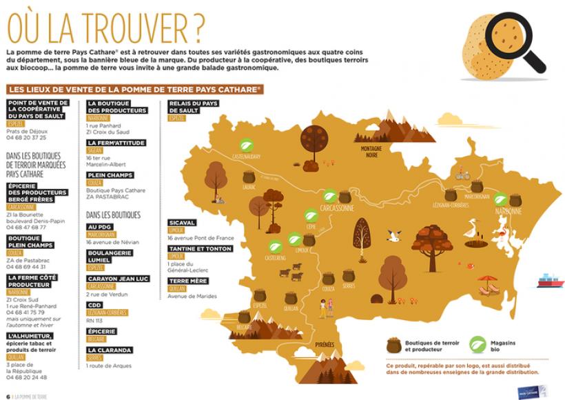 14 producteurs sont engagés avec la marque Pays Cathare, qui a labellisé la pomme de terre du Pays de Sault en 2010. Laquelle se décline en cinq variétés : Altesse, Beauvais, Désirée, Marabel et Monalisa, qui se prêtent à des milliers de recettes, des plus simples aux plus élaborées, pour tous les plaisirs de la table.