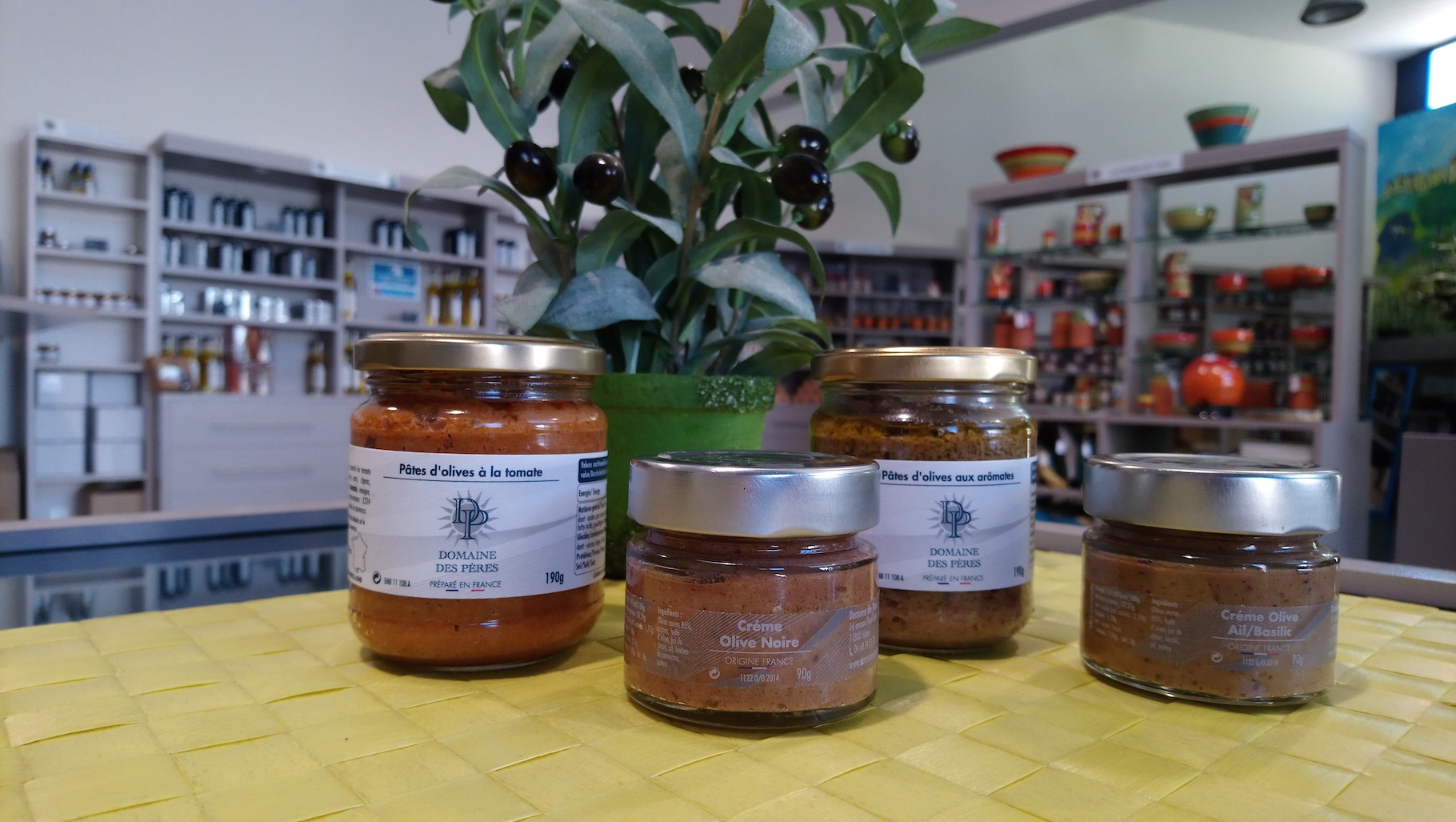 Le Domaine des Pères propose également ces purées vertes, mixées très finement avec ail et basilic ou uniquement à partir d’olives noires. Mais elle élabore aussi dans les ateliers des Jardins de la Haute Vallée une gamme de pâtes d’olives parfumées avec de l’ail, des câpres et de la moutarde, puis aromatisées soit aux herbes, soit aux tomates.